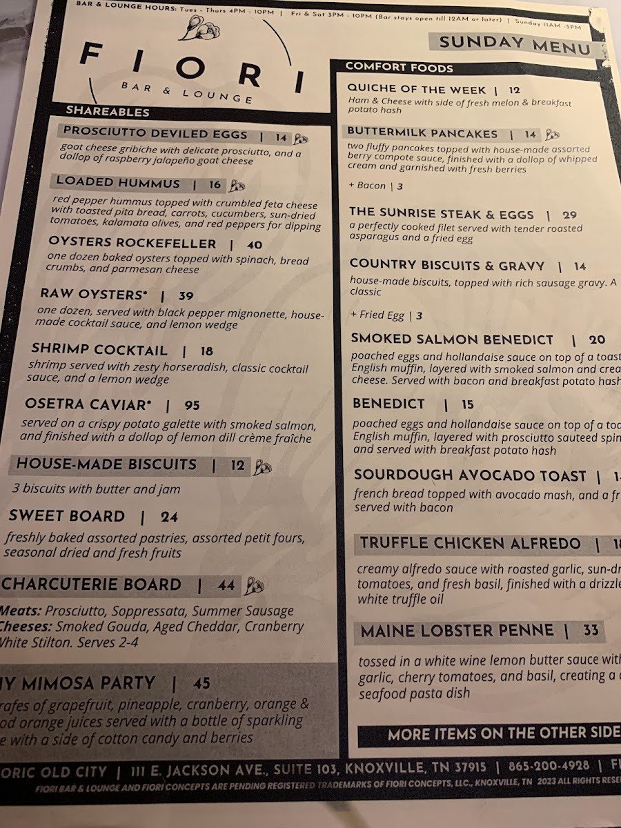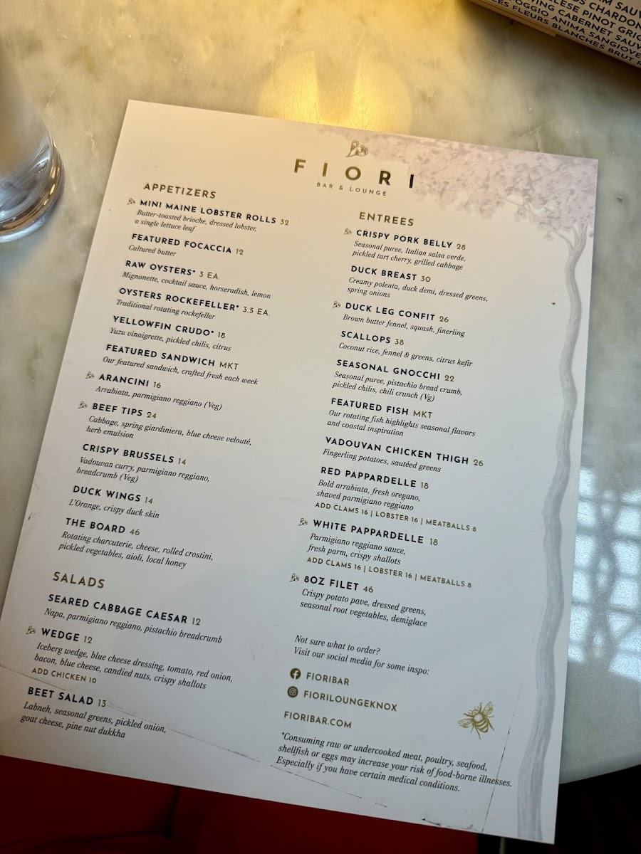Food and drink at Fiori Bar & Kitchen invite a pace where enjoyment and easy conversation mix effortlessly, matching the elegant but unpretentious environment found in the heart of downtown Knoxville.